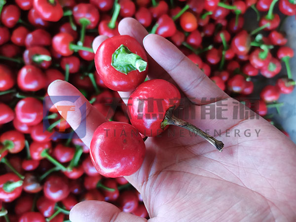 草莓椒的堆放厚度與其他辣椒大概力求一致,一般20~30厘米為宜,堆放太薄,透氣性好,風阻小,雖然有利于熱交換,但草莓辣椒烘干機內的熱空氣與辣椒的接觸時間相對縮短,熱利用率低,若堆放太厚,則阻力增太,熱空氣無法穿透物料層,烘干結果較差。