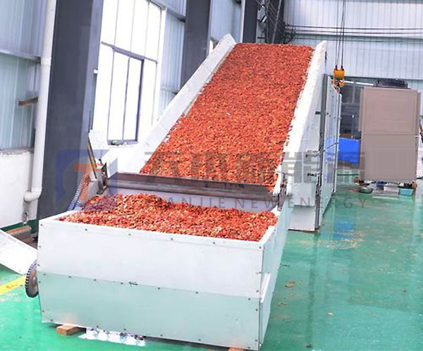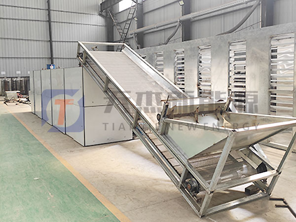 4、燙后將山楂片鋪排在山楂烘干機輸送口處,推入山楂切片烘干一體機